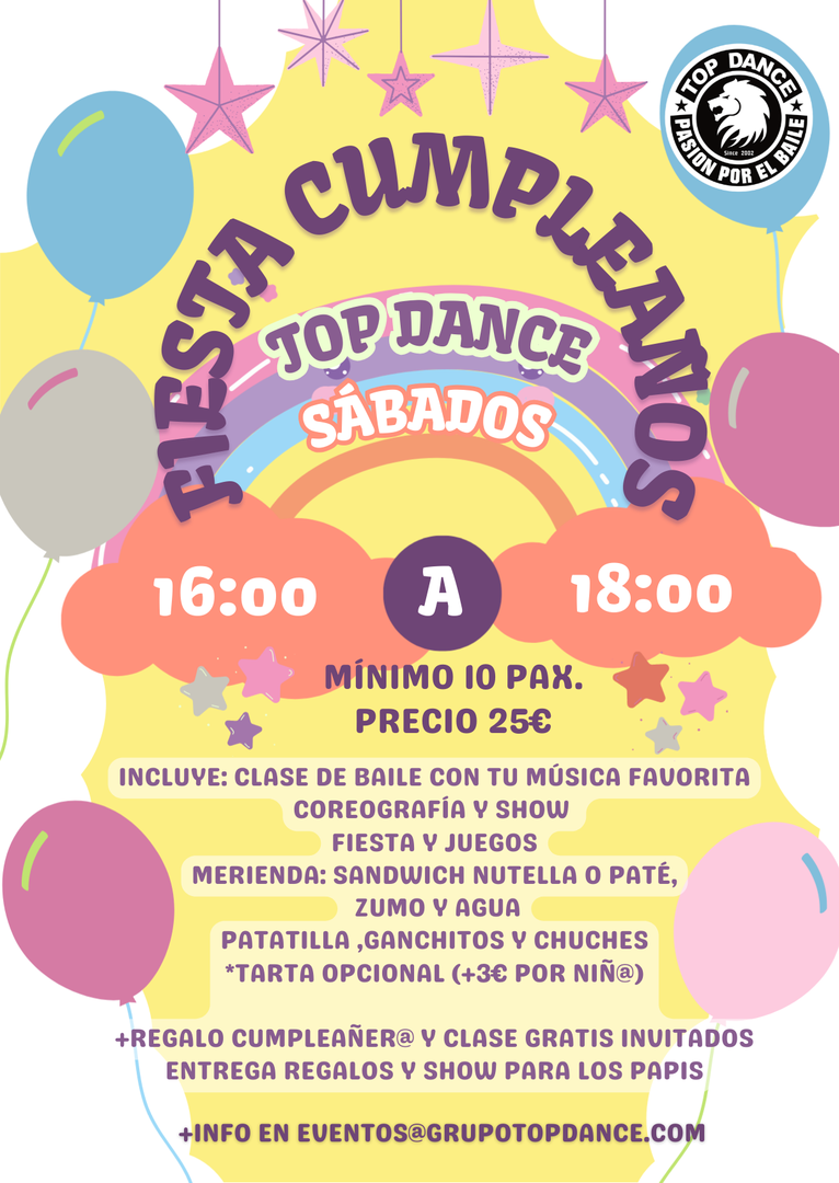 TOP DANCE MALLORCA le ofrece la posibilidad de realizar el cumpleaños de su hija/o en nuestras instalaciones de